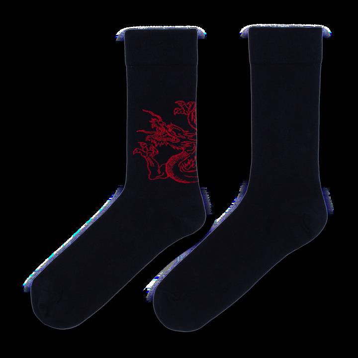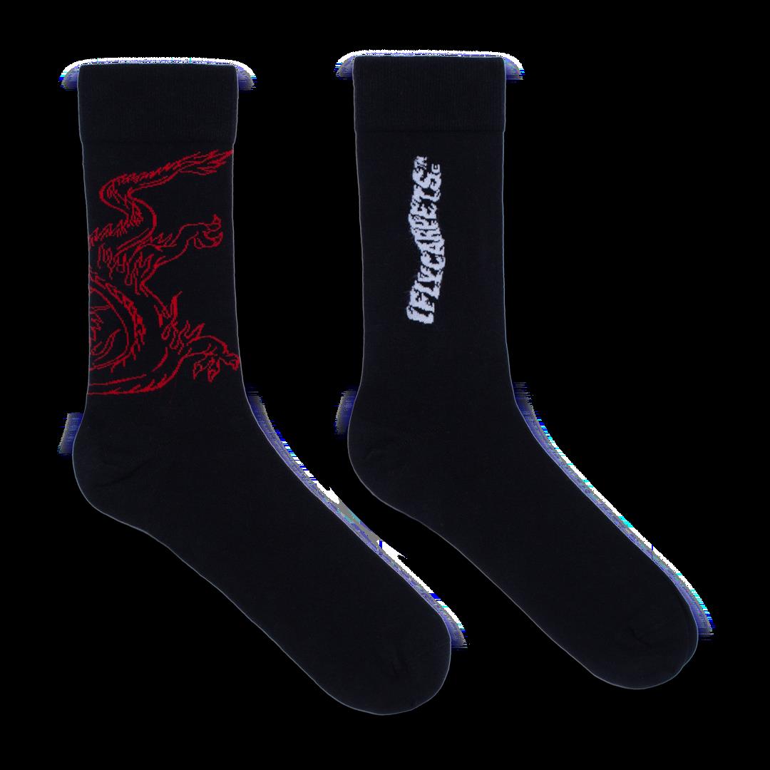 Siyah zemin üzerine bir çift çorap, biri dinamik kırmızı ejderha grafik detayıyla, diğeri küçük boyutlu beyaz LES BENJAMINS yazı baskısıyla tamamlanmış. Yumuşak dokulu jarse kumaşı, gün boyu konfor sunarken, grafik detaylar modern sokak estetiğini yansıtıyor.