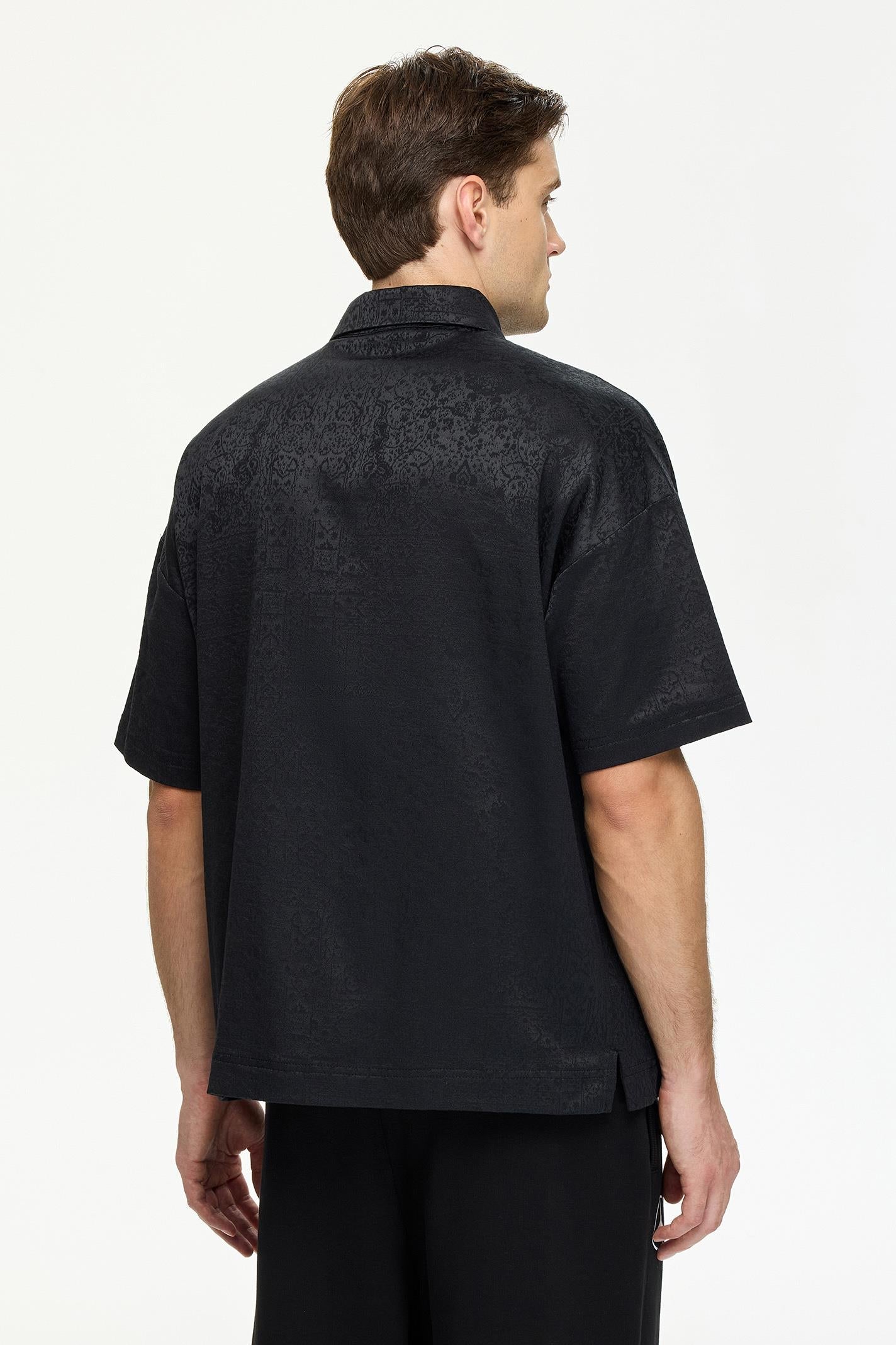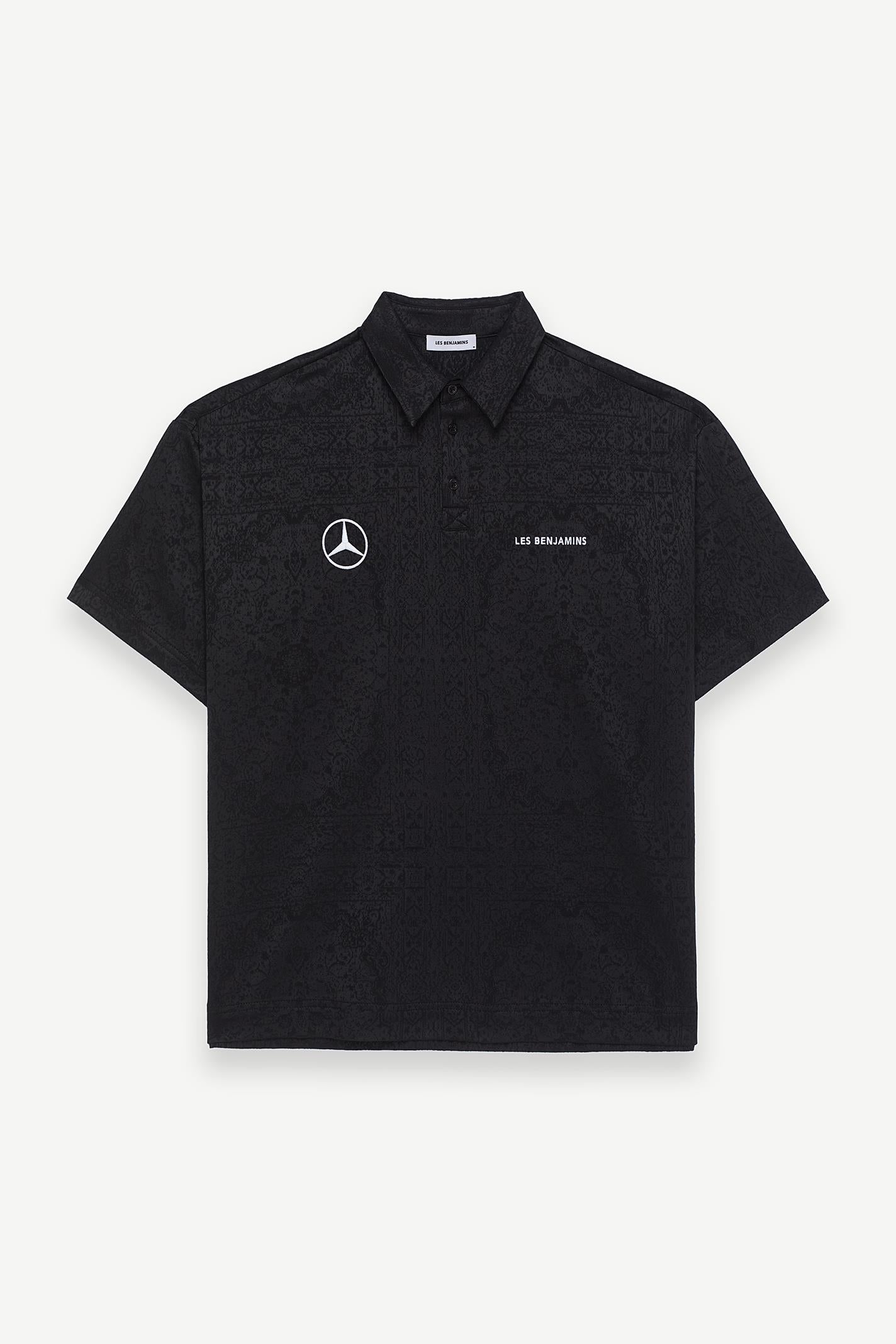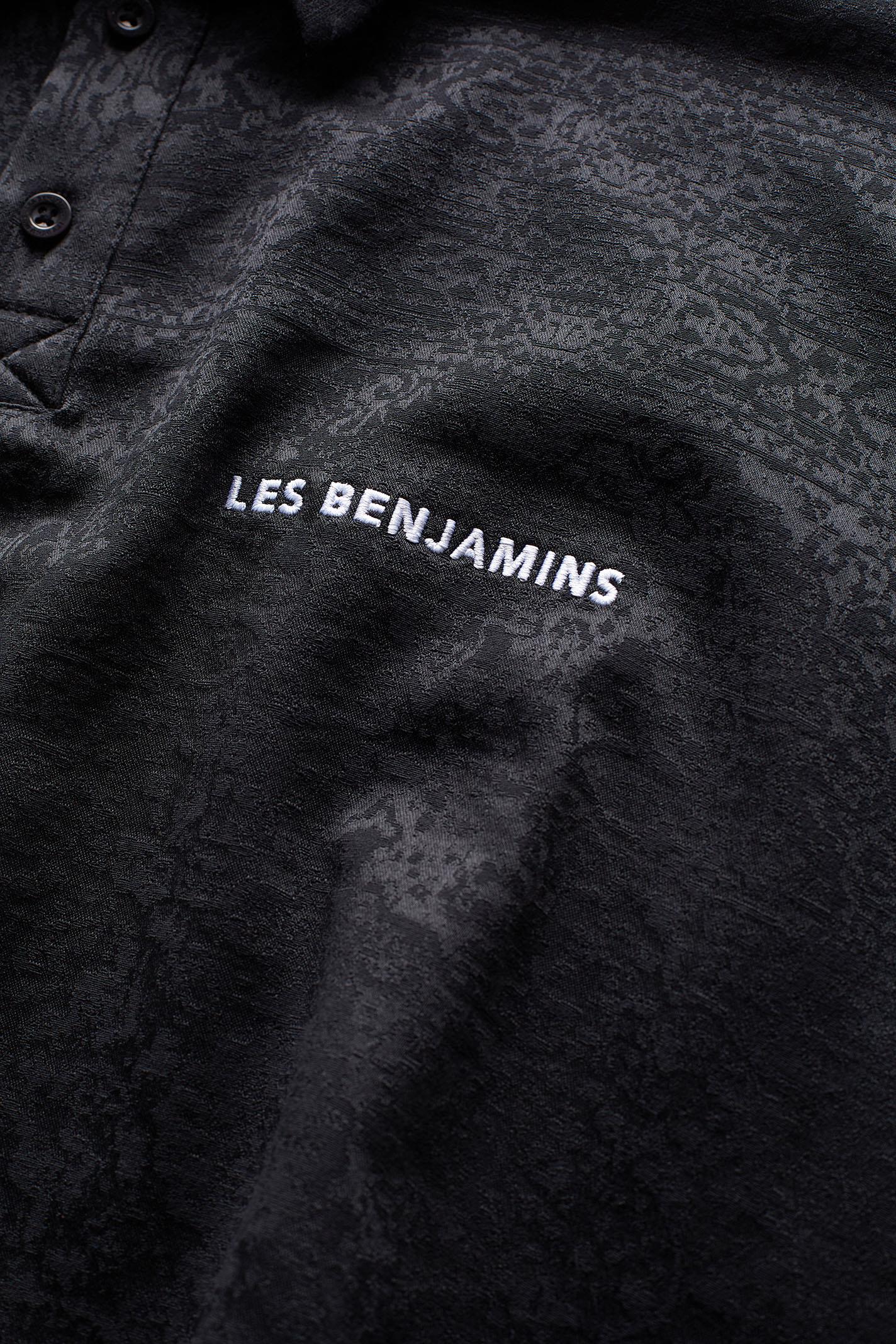 Jacquard desenli siyah polo yaka tişört, modern şehir stiline sofistike bir dokunuş katıyor. Kısa kollu yapısı ve regular fit kesimi, gün boyu hareket özgürlüğü sunar. Yumuşak jersey kumaşı hem konforlu hem de dayanıklıdır. Göğüs kısmında yer alan orta boy LES BENJAMINS baskısı, tasarıma çağdaş bir vurgu yapar. Günlük yaşamdan geceye geçiş için ideal bir tercih.